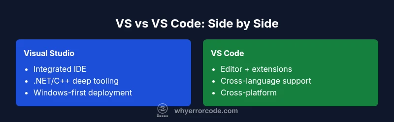 differences between vs and vscode shape how developers approach projects. Visual Studio (VS) is a full-featured IDE designed for large, integrated workloads, while Visual Studio Code (VS Code) is a lightweight editor focused on speed, extensibility, and cross-language work. This quick comparison clarifies the core distinctions you need to pick the right tool for your workflow.