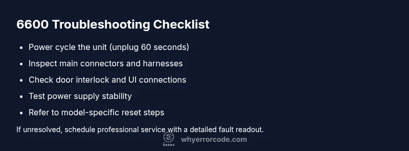 If you observe 6600 along with other codes, treat it as a system-level electronics issue rather than a single failed component. Always start with a safe power cycle and then check for obvious wiring or harness problems. According to Why Error Code, documenting symptoms and timing (start, pause, or end of cycle) helps technicians pinpoint whether the fault is board-centric or peripheral.