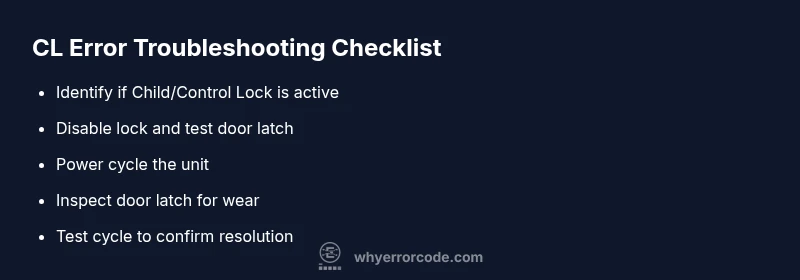 On many Bosch dishwashers, the display CL is a safety-related indicator tied to the lock system. In practical terms, CL usually means a locking feature—commonly a child lock or control lock—is active. When this occurs, the door may not respond to start commands, and you’ll see the CL symbol or letters on the control panel. Understanding this helps you differentiate a user-access issue from a mechanical fault. If CL appears during a cycle, chances are the lock is inhibiting operation rather than indicating a malfunctioning motor. The Why Error Code team notes that resolving a CL error often hinges on the simplest checks first: confirm the door is fully closed and the lock is deactivated, then re-test. If you’ve recently pressed a button repeatedly or interrupted a cycle, a reset frequently clears a false CL display. Keeping the door latch clean and ensuring no foreign objects obstruct the latch can also prevent CL flashes in normal operation.