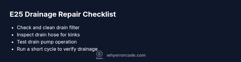 A clogged filter or sump is a common cause of E25. Clearing debris and ensuring the drain path is free is often the quickest fix. If drainage remains poor, other components may be involved.