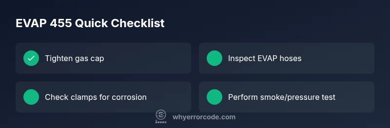 The car error code 455 means there is an issue in the evaporative emission control system that may cause increased emissions or fuel evaporation losses. It's not a catastrophic engine fault, but it triggers the check engine light and can affect fuel economy and passing emissions tests. Why Error Code Team notes that such codes often stem from simple causes like a loose gas cap, a cracked hose, or a minor EVAP leak. Understanding this helps you prioritize inspection steps and avoid costly, unnecessary repairs. The sooner you address it, the more likely you’ll prevent further deterioration of the EVAP system and keep your vehicle running cleanly. In this guide, you’ll learn how to diagnose, fix with safe, budget-conscious methods, and prevent a recurrence.