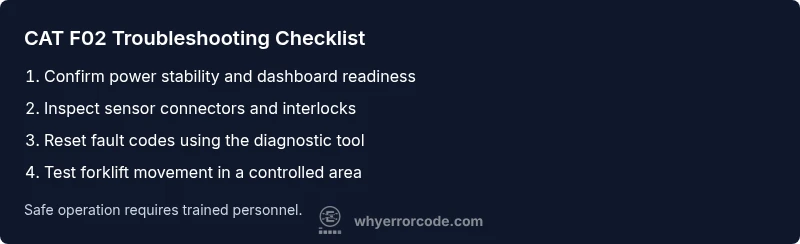 The Why Error Code team emphasizes that F02 can be model-specific, so locate the exact CAT service bulletin for your forklift series. Safety interlocks, seat switches, and emergency stop circuits frequently appear in F02-family faults. If a battery disconnect or power instability is present, it can mimic sensor faults and trigger F02. By understanding this context, operators can avoid risky workarounds and prepare for a precise diagnostic. The takeaway is to treat F02 as urgent, not routine; it demands calm, methodical testing and proper reset procedures when safe to perform.