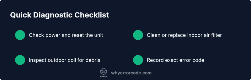 Daikin mini split error codes are diagnostic signals emitted by the unit when it detects a fault. Each code maps to a specific area of the system—airflow, sensors (thermistors or temperature sensors), refrigerant status, drainage, or indoor/outdoor communication. The goal is to quickly identify the likely subsystem and guide your next steps. According to Why Error Code, start with a safe power cycle and then perform quick checks on airflow and filters. For most homeowners, understanding whether the issue is airflow, a sensor fault, or a communication hiccup helps prioritize fixes and reduces unnecessary service calls. The codes themselves are documented in the user manual and usually in the unit’s display or app if available. Keep your model, serial number, and installation date handy; when codes persist, a structured diagnostic flow yields faster, more accurate repairs.