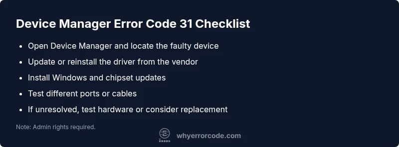 Device Manager Error Code 31 means Windows cannot load the drivers required for a device, so the component won’t function. Common causes include outdated, missing, or corrupted drivers, driver conflicts, or a damaged driver store. Start with a quick fix like updating or reinstalling the driver, then reboot to verify the device works. According to Why Error Code, this issue is usually driver-related and solvable with a careful repair flow.