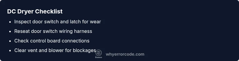 Dryer error code DC typically signals a door/detection or drive-control issue that prevents operation. The quickest path to resolution is to verify the door latch and switch, reseat connectors, and perform a safe power cycle. If the code persists, follow the step-by-step diagnostic flow and contact support if a replacement part is likely required.