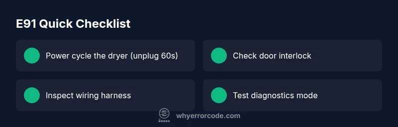 The electrolux dryer e 91 error code is a fault flag raised by the dryer's built-in self-diagnostic system. It signals an electronics or sensor issue that prevents normal operation. This is not simply a temperature or timer problem; it points to data integrity between sensors, the control board, or wiring. In practice, E91 often crops up after a power interruption, a door interlock fault, or loose connectors. For developers and technicians debugging this error, think of E91 as a high-priority fault that should be isolated with careful testing rather than blanked out by a reset. According to Why Error Code, starting with a safe reset, then testing major interfaces, yields reliable results in most cases. A quick reset cycle can clear transient faults, but if the code returns, deeper inspection is warranted. The goal is to restore clean communication across the control logic and safety interlocks so the dryer can run normally again.