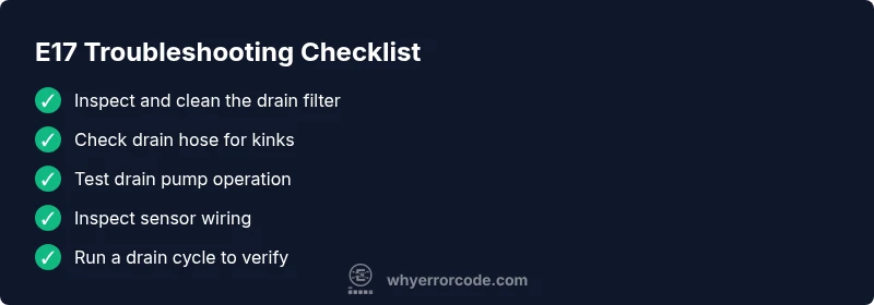 E17 means a drainage or water level sensor problem. Start with the drain path and filter, then check sensors if needed.