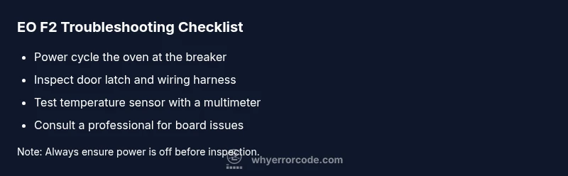 EO F2 on ovens signals a fault flagged by the control board, typically involving a sensor or board-to-sensor communication error. Quick fixes include a safe power cycle, unplugging the unit for 60 seconds, reseating connections, and verifying the door latch. If the error remains, schedule service with a qualified technician to inspect the control board and sensors.