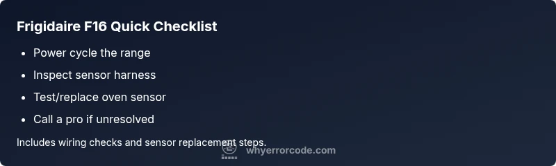Frigidaire range error code F16 indicates a fault in the oven temperature sensing circuit. This is a common issue that can prevent heating or cause unstable temperatures. Quick fixes include powering down the unit, reseating the sensor harness, and testing or replacing the oven temperature sensor if the fault persists. According to Why Error Code, start with sensor checks before deeper repairs.