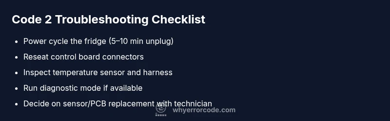 Code 2 signals a sensor or control fault that prevents proper cooling. It typically requires checking the temperature sensor, wiring, and control board. A reset often clears transient faults, but repeated codes indicate a component fault needing repair or replacement.