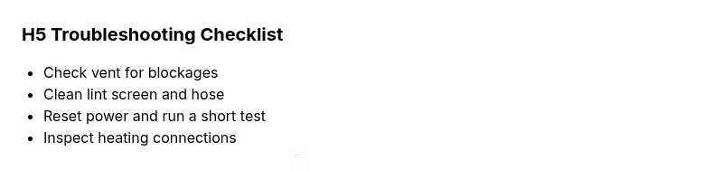 H5 usually points to a heating or sensor fault. Start with airflow and a power reset, then inspect heating parts if it doesn’t clear.