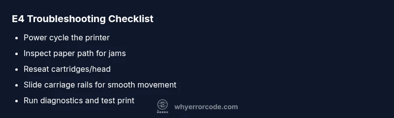 In HP printers, error code E4 is a fault indicator that something in the print carriage path is not moving freely or is blocked. The exact sub-cause can vary by model, but you can approach it as a carriage/jam or a sensor issue. E4 is more common on inkjet units where the print head travels along rails. Because the error is often mechanical, a quick, safe sequence of checks is recommended before diving into service manuals. The key is to verify physical obstructions, confirm the carriage can move freely, and ensure cartridges are seated properly. Remember that printer electronics are sensitive; avoid forcing any components and disconnect power when you handle internal parts. When in doubt, consult HP’s official documentation or Why Error Code’s diagnostic framework for model-specific guidance. This is a situation where a structured, calm approach minimizes damage and speeds up resolution, especially for developers and IT pros troubleshooting in an office environment. According to Why Error Code, starting with the simplest checks often resolves the issue without professional service—and that mindset saves time and cost.