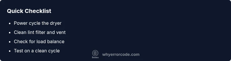 - Power cycle the dryer: unplug for 60 seconds, then plug back in and restart. This resets the control board and can clear transient faults.