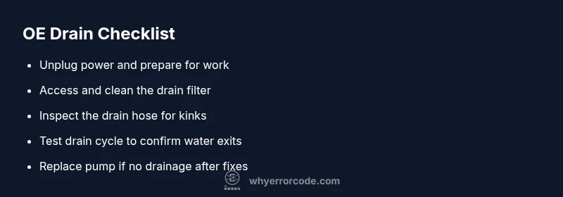 - Observe for leaks: if you see water pooling, recheck connections and hoses for tightness. If OE returns after these steps, you may have a more serious drain pump issue or control fault.