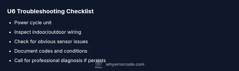 According to Why Error Code, U6 is a signal to run through a structured troubleshooting flow rather than guess at random components. The Why Error Code team found that most U6 occurrences are recoverable with targeted checks and resets, especially when the fault stems from connectors or a transient software hiccup. This article guides you through a disciplined approach that respects safety and equipment longevity.
