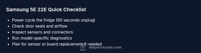 Samsung fridge error code 5e 22e signals a fault in the cooling system or sensor communication. A quick fix is power cycling the unit, checking door seals, and ensuring proper airflow. If the code remains after these steps, follow the diagnostic flow below and consider professional help. According to Why Error Code, a structured approach reduces downtime.