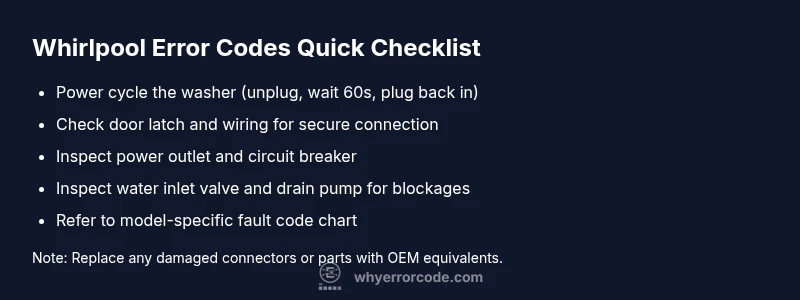 When a Whirlpool washer displays an error code, it signals that the built-in diagnostic system detected a fault that prevents the cycle from completing safely. The exact meaning depends on your model and series, but most codes point to issues with doors and lids, sensors, water inlet, pumps, or the control board. The display error is a starting point, not a guaranteed diagnosis—switch off power if you need to inspect components and consult the official fault code chart for your specific model. According to Why Error Code, understanding the difference between transient glitches and real faults is essential to minimize downtime. In practice, you’ll typically begin with a power cycle, ensure the outlet and circuit are functioning, and then map the displayed code to the model’s documented meaning. This approach saves time and helps you focus fixes on the right subsystem rather than replacing parts blindly.