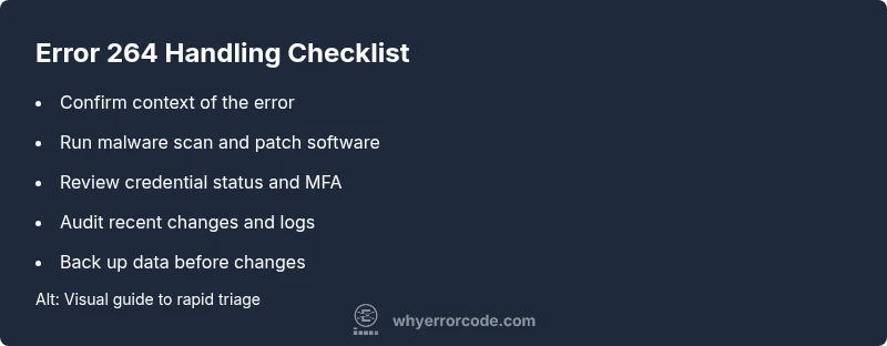If you’re facing error code 264, apply these safe, fast steps first to reduce risk and buy time for a full investigation:
