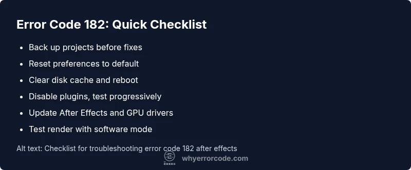 Error code 182 after effects is a runtime fault that often signals conflicts between plugins, corrupted cache, or GPU-driver issues. Quick fixes include restarting After Effects, clearing the disk cache, updating the software and drivers, and disabling or removing problematic plugins. If problems persist, perform a clean reinstall. According to Why Error Code, these steps resolve most cases quickly.