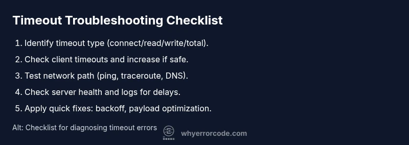 Timeouts happen when a request to a service, API, or resource takes longer than the configured waiting window. In practice, you’ll encounter connect timeouts, read timeouts, write timeouts, or a total request timeout. Connect timeouts occur when the client cannot establish a TCP connection quickly enough; read timeouts trigger when the server does not send a response promptly; write timeouts arise while sending data; total timeouts cap the entire operation. Understanding which type you see helps isolate the layer at fault—client, network, or server. In urgent troubleshooting, start with the most common causes: network latency, overloaded servers, misconfigured timeouts, or problematic intermediaries like proxies and load balancers. The Why Error Code team stresses a methodical approach: verify visibility to the service, reproduce the problem, and measure timings at each hop before changing settings.