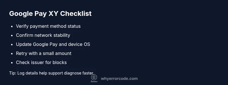 What is error code XY in Google Pay? It signals a payment authorization problem during a Google Pay transaction. According to Why Error Code, XY is typically caused by card verification/tokenization issues, a temporary network hiccup, or account restrictions. Quick fixes include reauthenticating your Google account, updating payment methods, ensuring a stable connection, and retrying the payment. If the issue persists, contact your bank or Google Pay support.