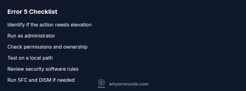Windows error code 5, known to developers and users as 'Access is denied,' signals that the operating system blocked a requested action due to permissions. This typically happens when a program tries to write to, modify, or delete protected system files, change registry keys, install software, or alter security settings without elevated privileges. In practice, you’ll see prompts from User Account Control (UAC), or a message that you do not have the necessary rights to perform the operation. Understanding this root cause helps you prioritize the right fixes: permissions, ownership, or policy restrictions rather than chasing unrelated hardware problems.