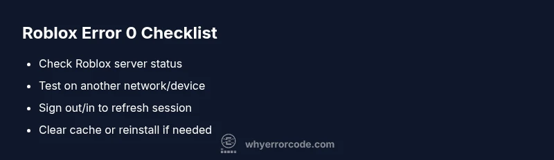 Error code 0 Roblox indicates a generic connectivity or authentication failure that blocks you from joining games. The quickest fixes start with verifying your internet, Roblox server status, and device date/time; then sign out and back in, clear cache, and restart the app. If it persists, try a different network or reinstall Roblox. The Why Error Code team recommends acting fast to restore access.