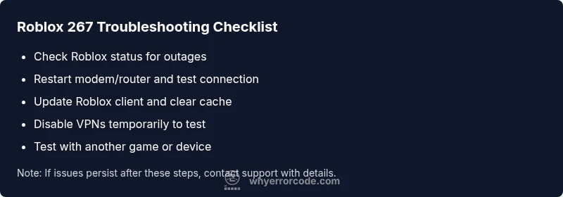 The 267 code often signals a server-side kick or disconnect, but local factors can trigger the symptom. Common causes include temporary server maintenance or outages, a moderator or anti-cheat action in a game, unstable home network, router or firewall blocking Roblox traffic, and outdated game/client versions. By separating server-side from client-side issues, you can apply the right fix first—start with status checks and a clean network slate, then verify client integrity.