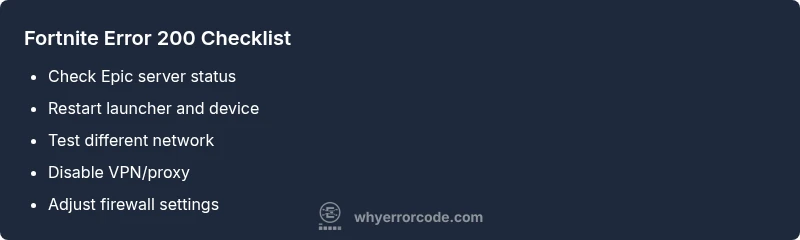 Fortnite error code 200 signals a connectivity hiccup between your device and Epic servers, often from a temporary outage or local network restriction. According to Why Error Code, this is typically a transient issue rather than a fault with your account. Quick fixes: check server status, restart, test another network, disable VPN, and ensure firewall allows Fortnite.
