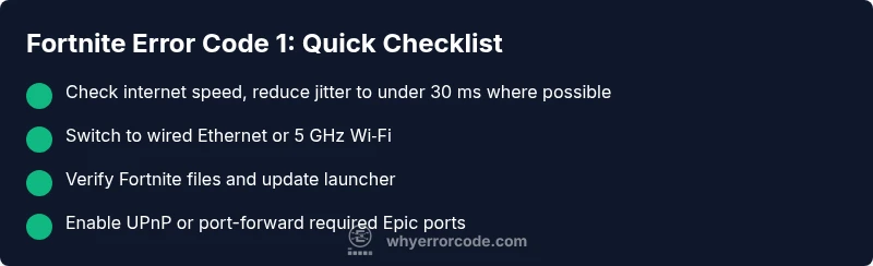 Error code 1 typically points to a connectivity problem between your device and Epic Games’ matchmaking servers. It can stem from your network, NAT type, or temporary server-side issues. Running through quick fixes or a diagnostic flow usually clears the issue.