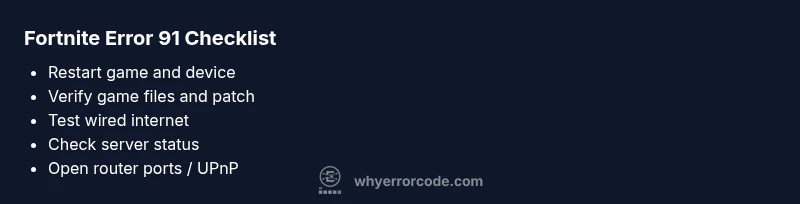 When Fortnite shows error code 91, it's signaling a problem at the network handshake stage between your device and Epic's servers. In plain terms, your game can't establish a stable connection to the matchmaking service, so you can't join lobbies or queues. This is typically a temporary glitch in connectivity rather than a fatal game error. According to Why Error Code, the root causes range from local network restrictions and outdated game files to transient server issues on Epic's end. The urgency comes from the fact that even small delays can produce cascading disconnects, preventing you from playing when you want to. The fix involves a mix of quick checks and targeted diagnostics. Start with simple, reversible steps, then move to more involved repairs only if necessary. By understanding the underlying network handshake, you can rapidly identify whether the problem is on your device, your local network, or the Fortnite servers. This article gives you a practical, urgent playbook to get back in-game as fast as possible.