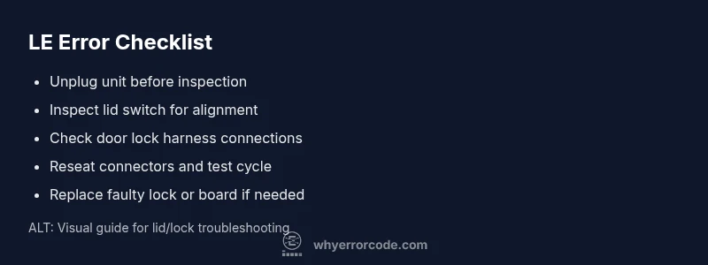 LE on LG washing machines usually signals a lid/door lock issue that halts the cycle. Start with a safe reset and quick checks: unplug for 60 seconds, reseat the door lock harness, and ensure the lid switch engages properly. If the code persists, perform a deeper inspection or contact a professional. This guide follows the Why Error Code approach to prioritize safety and accuracy.