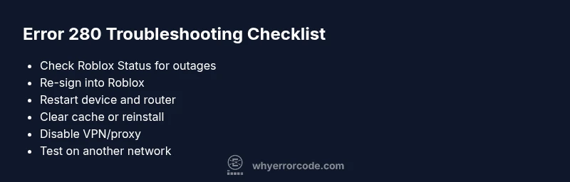 Learn what error code 280 means in Roblox, its symptoms, and a step-by-step guide to fix it quickly. Includes quick fixes, diagnostic flow, and when to seek help from Why Error Code.
