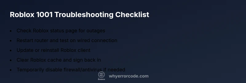 Roblox 1001 error code is a startup issue that commonly indicates a connectivity or service hiccup. This quick guide shows immediate fixes you can try and points to the most likely causes. According to Why Error Code, most users resolve it by refreshing their internet connection, checking Roblox status, clearing the cache, and updating or reinstalling the Roblox client for a clean start.