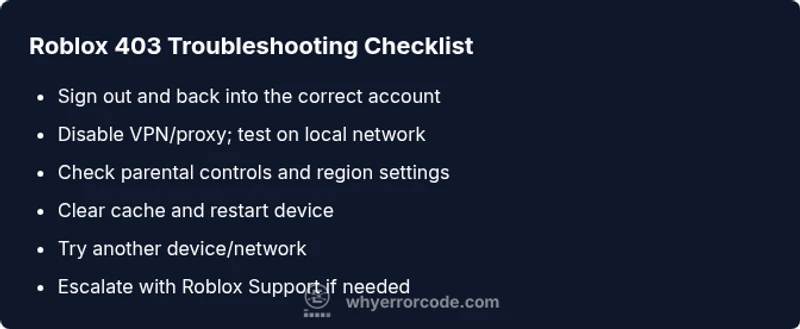 A Roblox 403 means access is forbidden. Check your account status and network, then try the fixes in order.