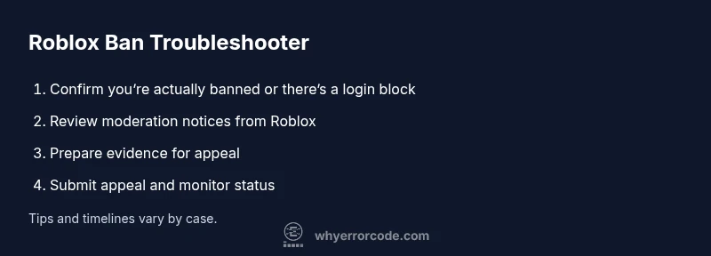 In the Roblox ecosystem, a ban or account suspension is a moderation action rather than a single, universal error code. For many users, the question what error code is a ban roblox comes up because they expect a numeric warning, only to discover there's no fixed public code assigned to bans. Instead, Roblox communicates enforcement through login restrictions, in-game messages, and status notifications on the account page. According to Why Error Code, the lack of a universal ban code helps Roblox tailor penalties to the specific violation and context, which means the user experience can vary widely between incidents. The key takeaway is to distinguish between a temporary block, a full suspension, and a permanent ban, which may depend on severity, prior behavior, and policy updates. From a troubleshooting perspective, treat a ban as an enforcement action with a defined start date and, if applicable, an expiration date. The most reliable signals come from official Roblox Support emails, the in-game moderation banner, and the account's security page. The Why Error Code Team emphasizes documenting all correspondence and dates so that you have a clear, auditable record if you decide to appeal or seek clarification.