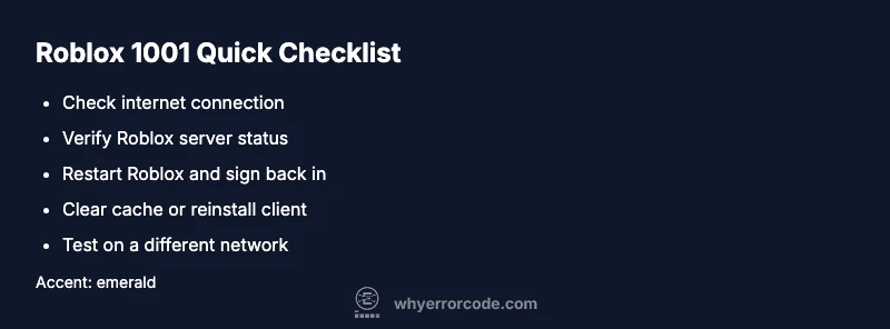 When Roblox displays error 1001, your client can't reach the game server or authenticate your session. This often means the game instance is temporarily unreachable, the login token is stale, or there is a disruption between your device and Roblox servers. In urgent terms, you’re blocked from entering a game until the underlying issue is identified and resolved. The error is typically transient, but persistent 1001 can signal deeper problems with your network, device configuration, or Roblox's own services. By understanding the root cause, you can triage quickly and avoid unnecessary tinkering.
