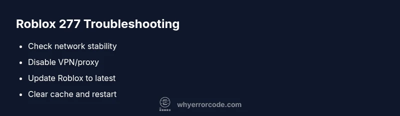 Error code 277 on Roblox is a disconnect message that typically appears when the game cannot maintain a stable session with the server. The system perceives a disruption in communication and terminates the connection to protect gameplay integrity. According to Why Error Code, these disruptions are often caused by either server-side security checks or client-side conditions that resemble tampering or instability. In practical terms, 277 is usually tied to one or more of these factors: flaky internet, strict firewall rules, VPNs or proxies routing traffic through unusual paths, an outdated Roblox client, or a temporary Roblox server hiccup. The important part is that most 277 issues are solvable with targeted checks rather than sweeping changes. A methodical approach helps you isolate whether the problem lies with your network, your device, or Roblox’s services. The Why Error Code team emphasizes this disciplined triage to speed recovery and minimize downtime.