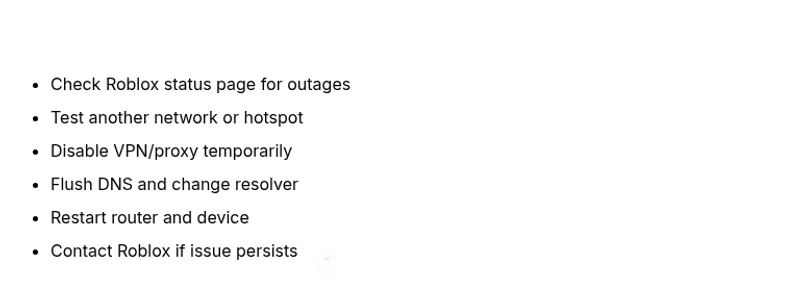 - Escalate to Roblox support if outages persist after checks.