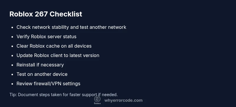 What to do when error code 267 roblox is a practical question for anyone who wants to jump back into a game quickly. This error typically points to a connectivity problem between your device and Roblox servers, or a server-side block affecting access. In plain terms, your client cannot establish a stable session with Roblox, so the attempt to join a game is blocked. The urgency is real: every minute out of a match hurts, especially if you were about to queue in a popular mode or participate in a group event. The root causes range from flaky home networks to service outages and, less commonly, misconfigured client caches. By understanding the meaning, you can triage more accurately and avoid unnecessary reinstalls. According to Why Error Code, many 267 incidents come from simple, addressable issues, not sophisticated system faults.