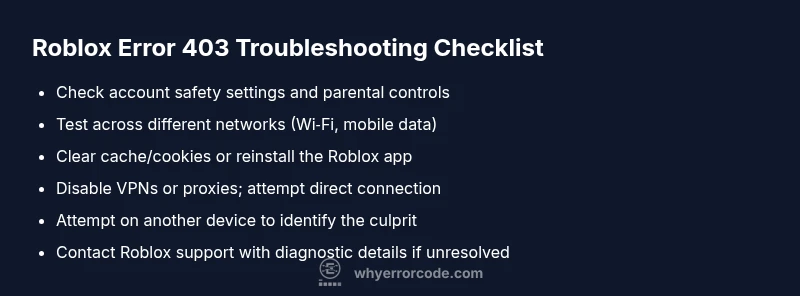 A practical, step-by-step guide to fix Roblox Error Code 403 quickly. Learn causes, diagnostics, fixes, and prevention tips for players, parents, and IT pros.