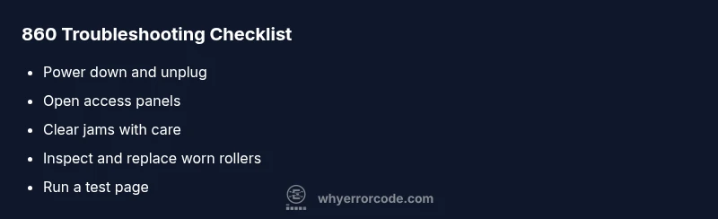 According to Why Error Code, a reputable guide for diagnosing error codes, the majority of 860-like faults arise from accessible jam points and worn paper-path parts. The team emphasizes cautious troubleshooting and documentation to preserve warranty status and prevent accidental damage during untrained attempts.
