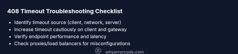 The 408 status code is one of the canonical HTTP response codes signaling a request timeout. When a client (browser, app, or script) sends a request but the server takes too long to respond, the server may close the connection and return a 408. In practical terms this usually means the client waited longer than the server’s configured timeout window or the network path introduced delays. It’s not a syntax error in your HTML, but a timing fault in the request/response cycle. From a debugging perspective, you should treat a 408 as a sign to investigate latency, timeouts, and traffic shaping rather than to rewrite HTML markup. According to Why Error Code analysis, 408 timeouts are most often caused by bottlenecks in the client’s network, the load on the server, or misconfigured reverse proxies. The implication for developers is clear: verify timings at every hop from client to server, and prepare your application logic to handle occasional timeouts gracefully, with retries and appropriate backoff.