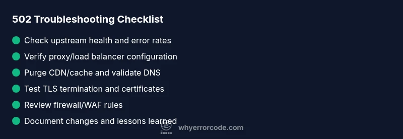 Urgent guide to understand and fix HTTP 502 Bad Gateway errors. Learn what it means, quick workarounds, a diagnostic flow, step-by-step repairs, and prevention strategies to restore service fast.