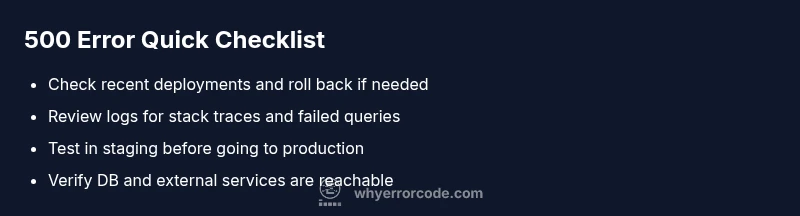 A 500 Internal Server Error is the HTTP status code that indicates a problem on the server side. It signals that the server failed to complete the request due to an unexpected condition, but it does not specify what went wrong. Unlike client-side 4xx errors, a 500 means the fault lies within the server’s software, configuration, or environment. The moment you encounter a 500, your primary objective is to determine whether the issue stems from recent deployments, code changes, or infrastructure. According to Why Error Code, this category of error should trigger a systematic server-side investigation, not a quick client workaround. In practice, you’ll see this error when an application throws an unhandled exception, a dependency fails to respond, or a misconfiguration prevents the app from booting. The takeaway is simple: treat 500s as a signal to inspect server health, logs, and stack traces, while presenting users with a generic message to avoid exposing sensitive details.