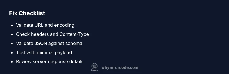 - Review the response body for hints; it often contains the exact field causing rejection. If the server returns a pointer (path to the bad field), focus your debugging on that field first.