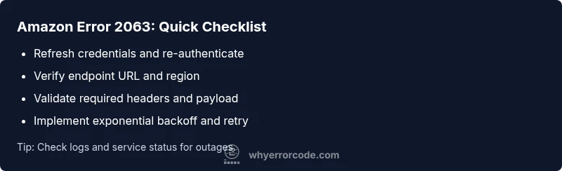 Urgent guide to diagnosing and fixing amazon error code 2063. Learn the meaning, diagnostic flow, and practical steps to restore access fast, with safety tips and professional guidance from Why Error Code.