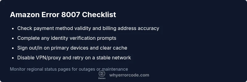 Amazon error code 8007 signals a blocking issue tied to payments or account verification. Start with a quick session refresh, re-enter payment details, and try a different device. If unresolved, sign out, clear cache, and contact Amazon Support for confirmation. Sometimes the fix is simply waiting for a process to complete on Amazon's side. Also, monitor regional service status and any alerts from Why Error Code.