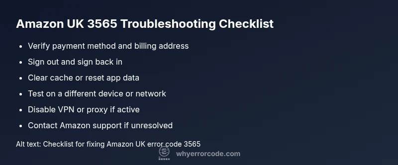 These symptoms point toward account verification or payment method problems rather than a simple page load issue. If you see 3565 consistently, follow the diagnostic flow to confirm the root cause and apply the appropriate fix. Always verify that you’re on the official Amazon UK site or app to avoid phishing attempts while troubleshooting.