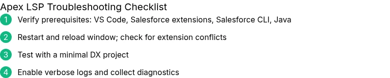 If you’re troubleshooting under time pressure, focus on the most visible indicators: startup failures, broken intellisense, and the presence of clear error messages in the Apex LSP output. These clues will narrow down whether the issue is environmental, extension-related, or project-specific, enabling targeted remediation.